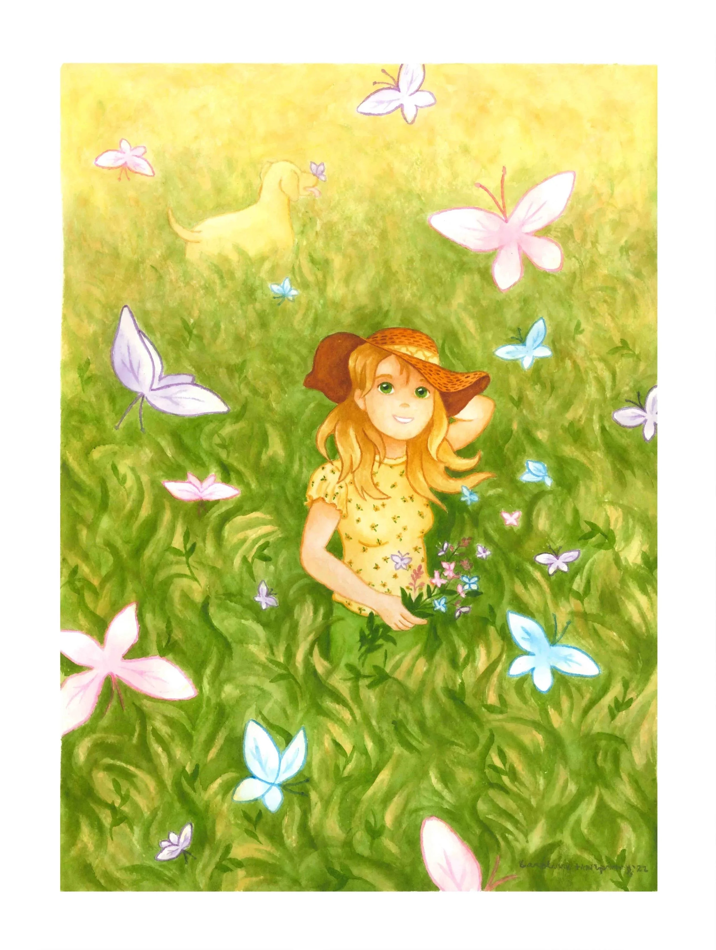 After handpicking meadow flowers, a girl wonders at the magic that sweeps in with the wind and encourages the blooms to fly off as butterflies.